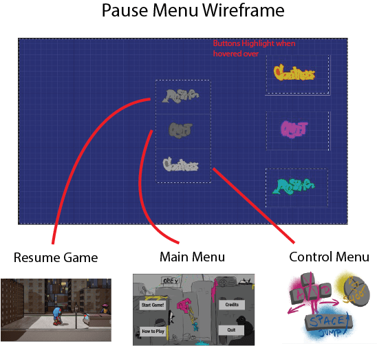This document is a Wireframe of our pause menu and what it leads to. It is pretty simple as a visual way to represent it and how it functions.