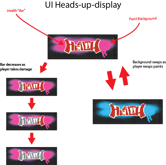 While the artists on our team worked on the assets for the UI for the HUD and menus, I was in charge of wireframing everything and implementing it with the current systems to work in game. I was also in charge of getting feedback on these elements and communicating with the art team to see the feedback implemented. One area where this was done was with the HUD. The important parts were displaying player health and the current color of the paint they were using. Through rounds of iteration, I came up with the design and flow of it to create a very adaptable UI that doesn’t clutter the screen and highlights the important info.
