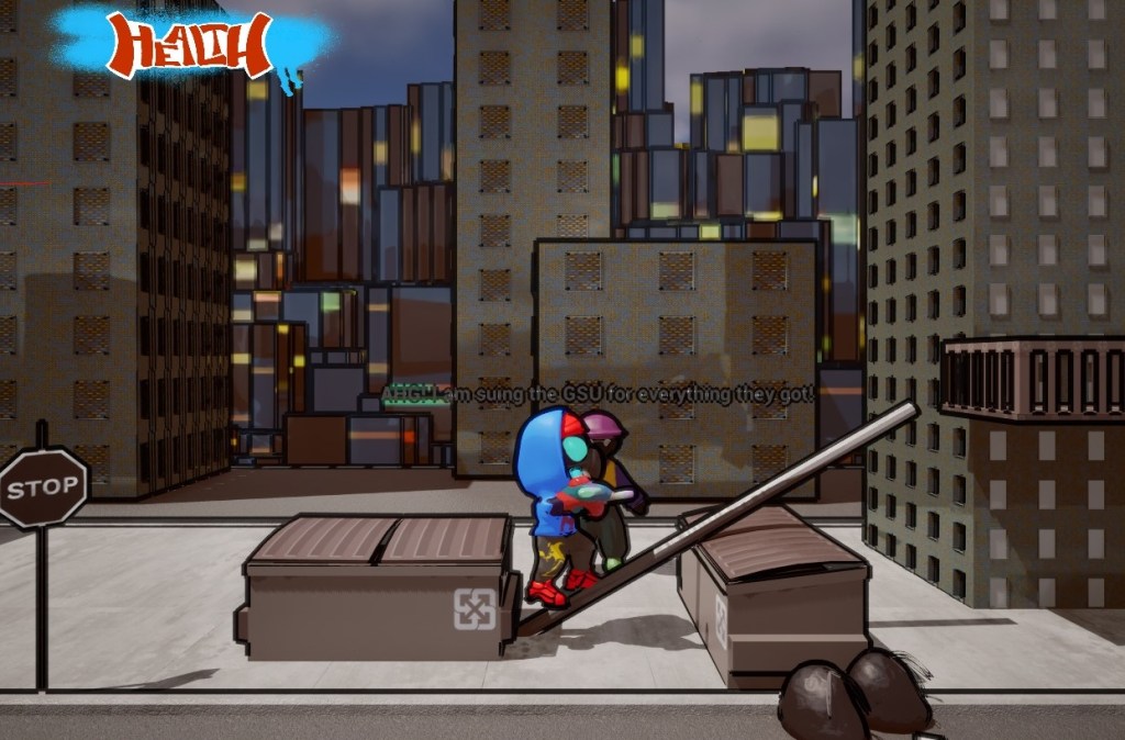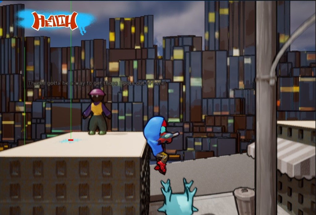 In Project Paint, the player explores a city devoid of color and style, taken over by a large corporation determined to keep all color for themselves. As a wandering street artist, your goal is to make it through the city by painting the environment to solve platforming and combat challenges. The player has a paintball gun they can aim and fire to paint any surface as well as enemies laid out by the corporation. The player can swap the color of paint to change the effect. The blue paint allows the player to bounce off of those surfaces like a trampoline, giving them more height and allowing them to bounce off of walls as well. The pink paint is sticky, slowing player movement, but allowing the to stick to walls to climb them. The player is also able to paint enemies and once an enemy is fully painted, they are stunned and the player can jump on them to defeat them. New paints can be unlocked throughout the course of the game and incentivize the player to back track in order to make it to new areas and explore with their new abilities.
