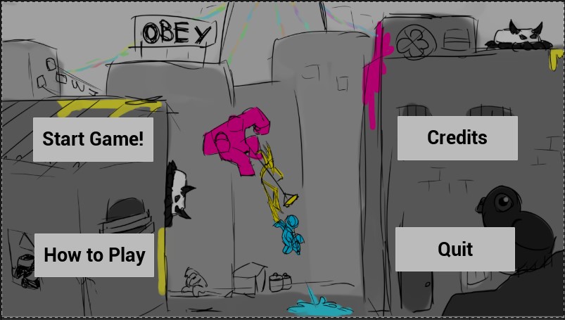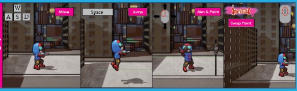 Controls were important to show off as to demonstrate how the player actually interacts and moves in the game. We have a basic system for 2D movement with A and D moving the player left and right, space allowing the player to jump, and the mouse used for aiming and firing paint onto surfaces.