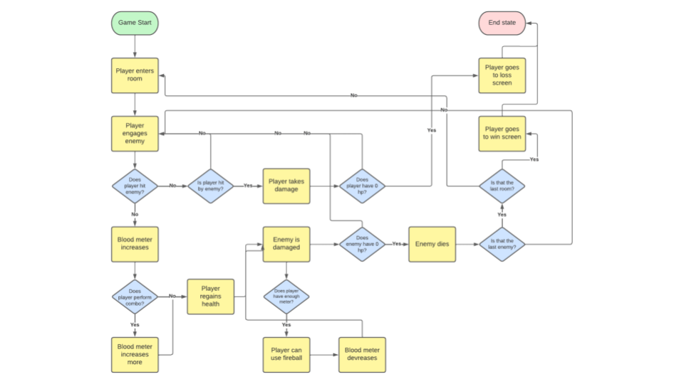 Flow Chart of full game loop, tracking progress between rooms and moment to moment gameplay in each room
