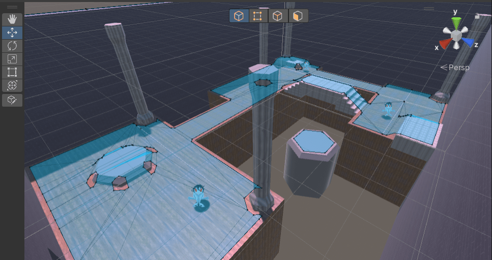 Editor view of Room 3, featuring pits that damage and reset player position and verticality the player can use to avoid enemies.