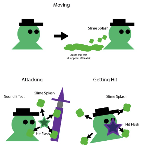 This image is one of the visual displays I created for realizing the effects needed for our basic enemy. It has descriptors for each part and arrows to convey how the particles would move. For example, our basic slime enemy would leave a trail while moving for immersion, create a slime splash effect when attacking to signal the player was hit, and a similar effect with different flair for Thing or Fist would play when the enemy is hit by either of them. This was give to the artists and other designers to aid in creating the effect that I would then tweak and apply where needed on the enemy Events.