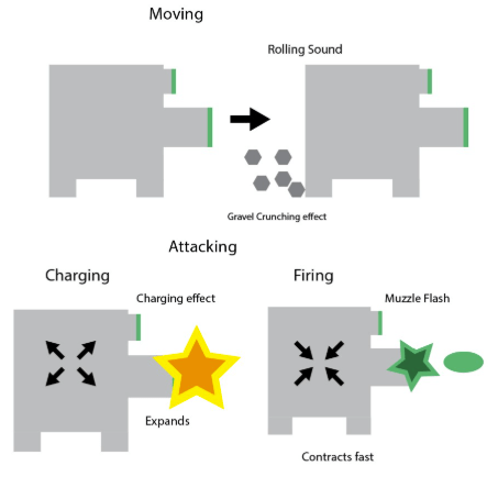 This display is one for a ranged enemy in the game. It shows a different style to the movement of it to convey what this enemy is in the world of our game, being a mechanical sentry. It also shows the plan to make it change size by expanding and contracting when firing. This will aid players into knowing when it will shoot, as well as leaning into the old cartoon influence of our game. Both of these graphs show the process of designing and implementing these effects and you can see how they developed into the final game.