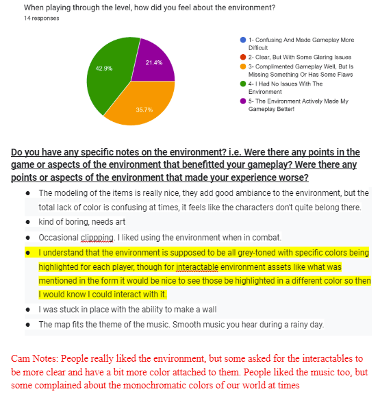 Our survey was split into multiple sections with questions looking for answers on a scale from 1 to 5 (bad to great). I created charts from the multiple choice answers given to show how the majority felt about each section of the game. Space was given as well for the testers to leave written feedback on each section and all of them were noted below the chart. The red text and highlights were added by me to note important feedback given and to summarize the thoughts of each section.